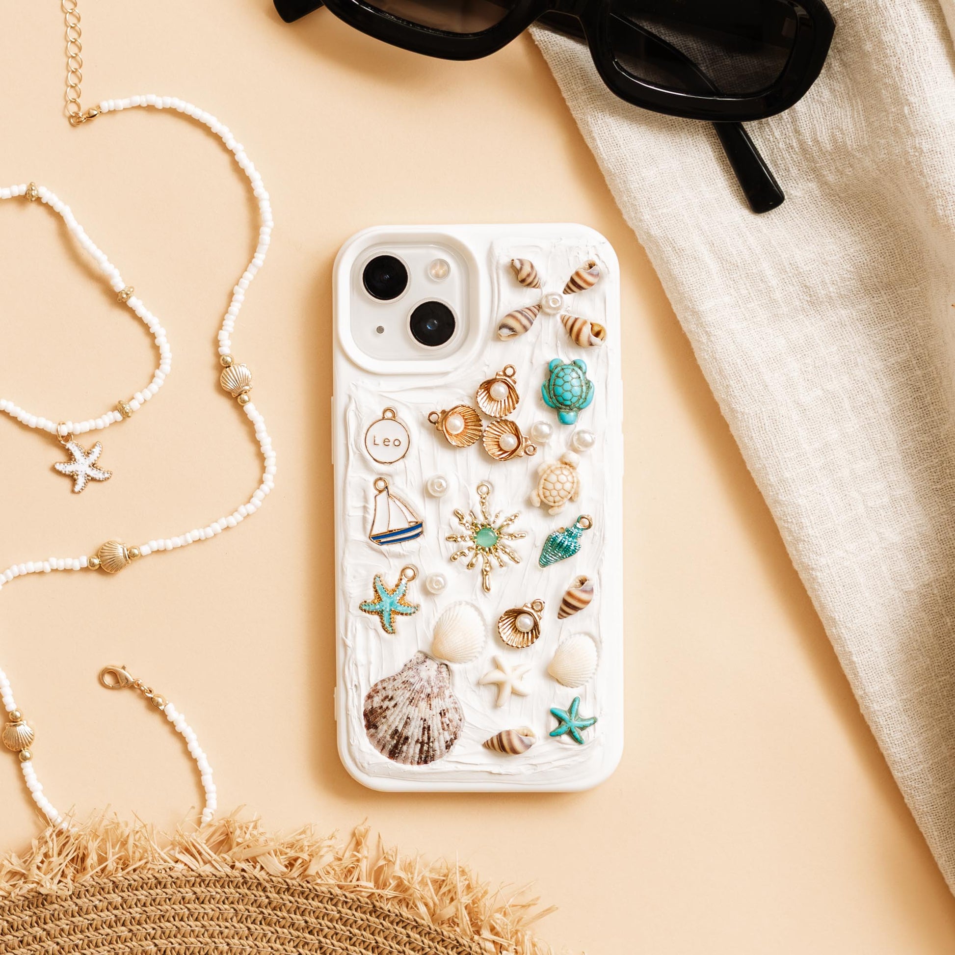 Met Ocean Treasure draag je de zomer altijd bij je. Dit unieke hoesje is met de hand gemaakt en versierd met een mix van schelpen, zeesterren, pareltjes en gouden details – stuk voor stuk zorgvuldig vastgezet op een romige witte ‘pasta’ basis. Het resultaat? Een one of a kind hoesje dat eruitziet als een klein strandschatje.