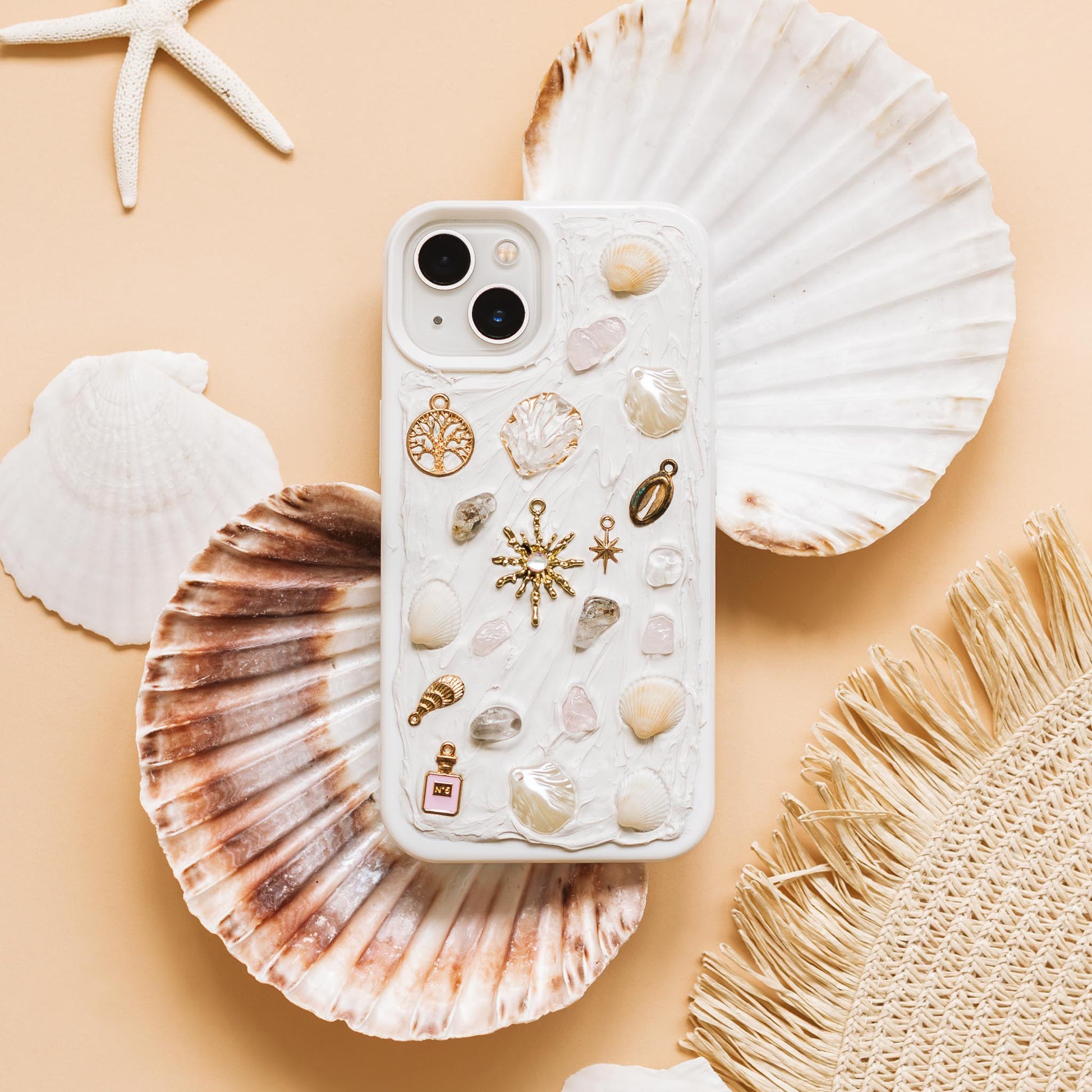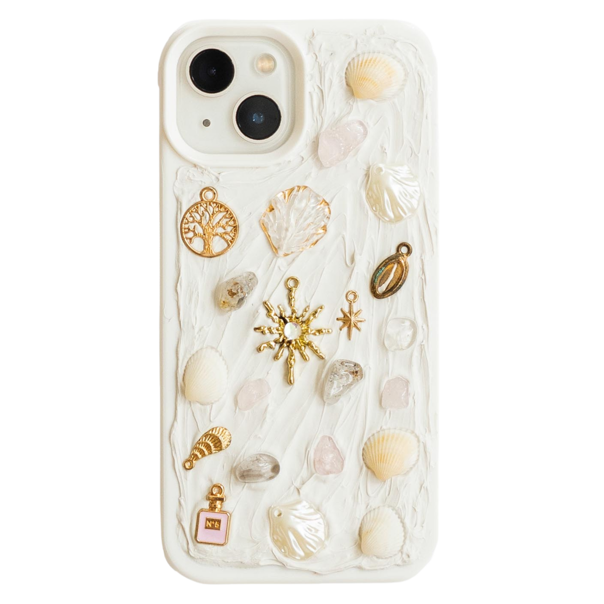 Zon op je huid, een warme bries en de zilte geur van zeezout – dát is het gevoel van Pearl Coast. Dit handgemaakte hoesje is geïnspireerd op zachte zomerdagen aan de kust en is afgewerkt met echte schelpen, kristalachtige steentjes, parelachtige accenten en gouden details. Alles zorgvuldig verwerkt in een witte ‘pasta’-structuur.
